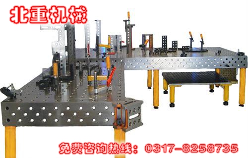 機器人焊接平臺的承載能力高,鋼性穩定,它的五個面均加工有規則的孔,并刻有網線。焊接平臺可方便地延伸和擴展,組合。經擴展的標準臺面可模塊化的定位和夾緊直接連接在一起。在安裝、調整和定位工件過程將柔性三維組合焊接工裝系統的通用功能展示的淋漓盡致,尤其在了大型工件方面的應用上。
